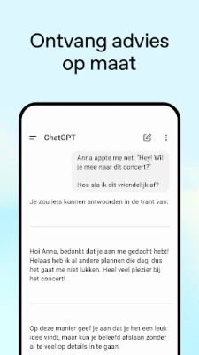 Laat ChatGPT uw persoonlijke gids zijn in elke denkbare situatie. Ontvang inspirerende ideeën voor het perfecte verjaardagscadeau of ontwerpen voor een unieke wenskaart. Verkrijg doordacht advies voor het formuleren van de juiste reactie of het navigeren door complexe persoonlijke situaties. Verdiep uw kennis op een speelse en interactieve manier, van het uitleggen van de werking van elektriciteit aan een kind met een passie voor dinosaurussen, tot het moeiteloos opfrissen van uw geheugen over belangrijke historische gebeurtenissen. Zelfs in de professionele sfeer biedt ChatGPT uitkomst, van het brainstormen over marketingcampagnes tot het finetunen van businessplannen. En voor die momenten dat u met een beperkt aantal ingrediëien kookt, genereert ChatGPT direct creatieve receptideeën.