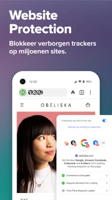 De bescherming van DuckDuckGo gaat verder dan alleen je browser. Met de revolutionaire Email Protection (momenteel in bèta) creëer je een uniek @duck.com e-mailadres, waarmee de meeste e-mailtrackers worden geneutraliseerd en je echte inbox verborgen blijft. En dankzij de ingebouwde App Tracking Protection beschermt DuckDuckGo jouw privacy zelfs binnen andere apps op je apparaat, door verborgen trackers preventief te blokkeren. Het creëren van een uniek digitaal profiel door middel van 'fingerprinting' behoort tot het verleden, en onnodige gegevensverzameling wordt actief tegengegaan. Daarnaast biedt DuckDuckGo het gemak van de Fire Button: met één tik wis je al je tabbladen en browsegegevens, waardoor je een schone lei creëert en ongewenste sporen direct verwijdert. Met de Global Privacy Control (GPC) geef je eenvoudig je privacyvoorkeuren aan bij websites.