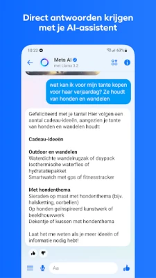 Messenger gaat verder dan alleen tekstuitwisseling en introduceert geavanceerde functies die je communicatie verrijken. Ontdek Meta AI, je slimme assistent die klaarstaat om vragen te beantwoorden, advies te geven, of je creativiteit een boost te geven met het genereren en bewerken van afbeeldingen. Verstuur je waardevolle foto's in kristalheldere HD-kwaliteit en organiseer ze eenvoudig in gedeelde albums om speciale herinneringen met je groepen te bewaren. Zelfs grote bestanden, van documenten tot spreadsheets tot wel 100 MB, deel je rechtstreeks in je chats, wat efficiëntie en gemak garandeert.