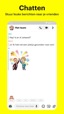 Verbind op een authentieke manier met vrienden via Snapchat. Stuur directe berichten in levendige chats, of deel je dagelijkse belevenissen met Groepsverhalen. Organiseer videochats met maximaal 16 vrienden tegelijk, waarbij je zelfs speelse Lenzen en Filters kunt gebruiken om de sfeer te verhogen. Druk je unieke band uit met exclusieve Friendmoji's, speciaal ontworpen Bitmoji's voor jou en je beste maatjes, en blijf op de hoogte van hun Verhalen en de dynamische content van de Snapchat-community.